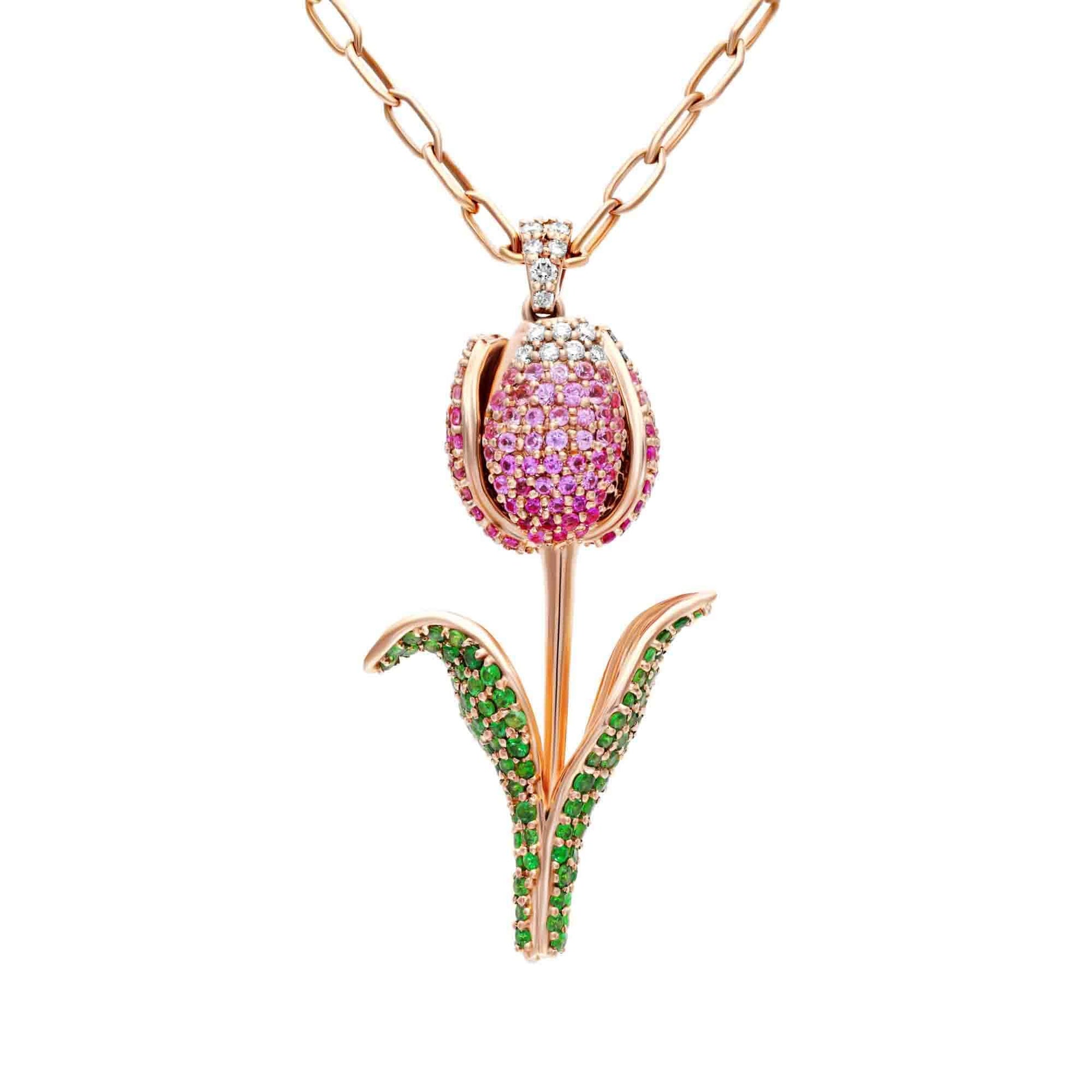 The Blossom of the Stars Pendant features a tulip in full bloom, crafted in luxurious gold and pavé-set with sparkling diamonds and your choice of coloured gemstones. The petals shimmer with vibrant pink sapphires, while the leaves are adorned with vivid tsavorites, adding a fresh, natural brilliance.
