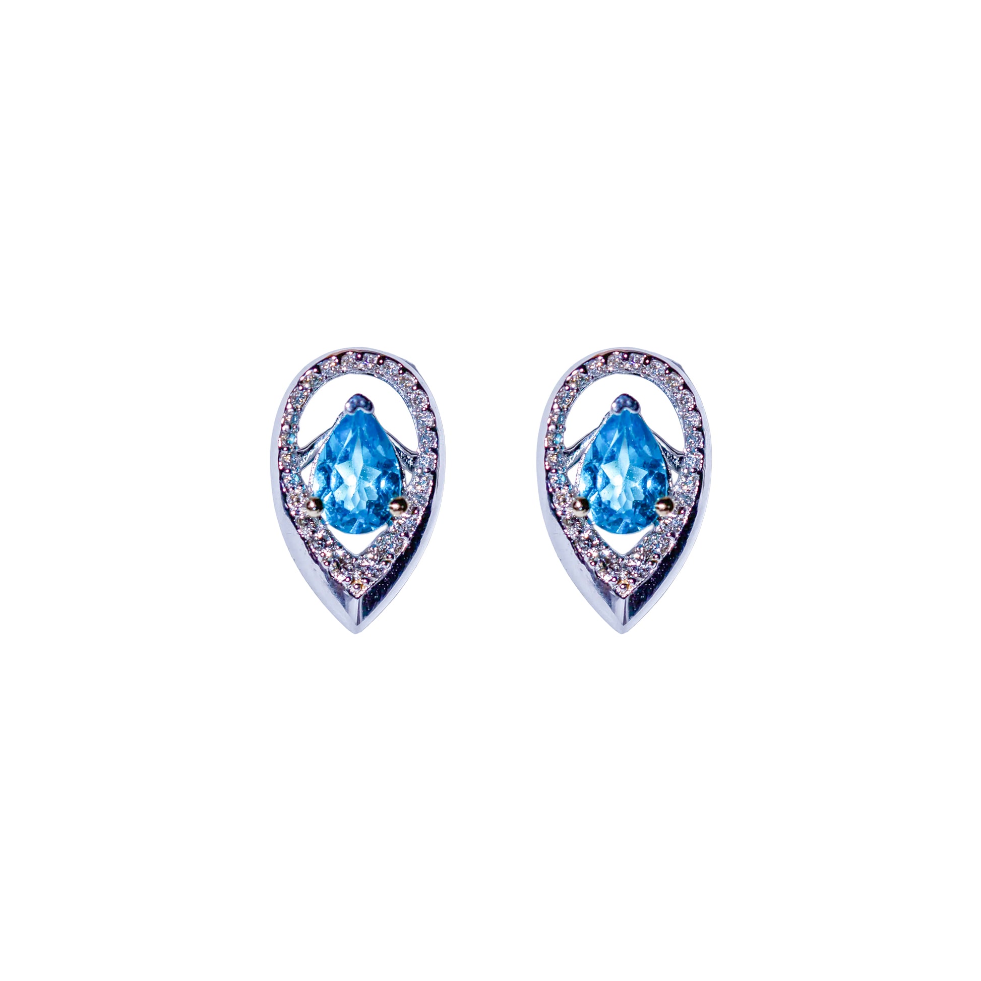 A captivating teardrop blue sapphire sits at the heart of these earrings, its rich ocean hue radiating timeless elegance. Surrounding the center stone, a fine halo of natural diamonds enhances its depth and luminosity, creating a beautifully balanced play of light.