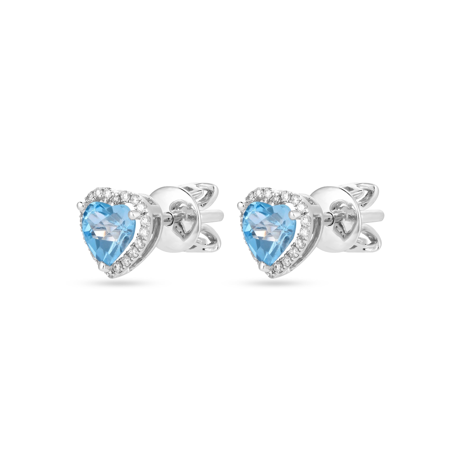 Crafted in sleek white gold, these heart-shaped blue topaz studs radiate the soft glow of twilight skies. Each gemstone is framed by a delicate halo of natural diamonds, adding a touch of star-like sparkle to every angle. A timeless blend of romance and celestial charm, perfect for elevating both everyday looks and special moments.